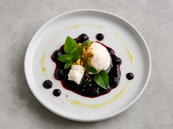 Burrata con arándanos horneados, menta y pistacho, acompañado de pan de masa madre.